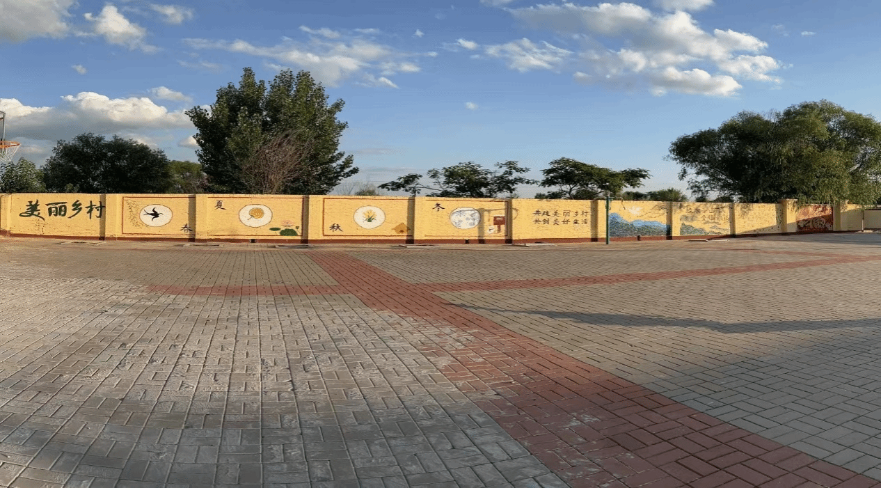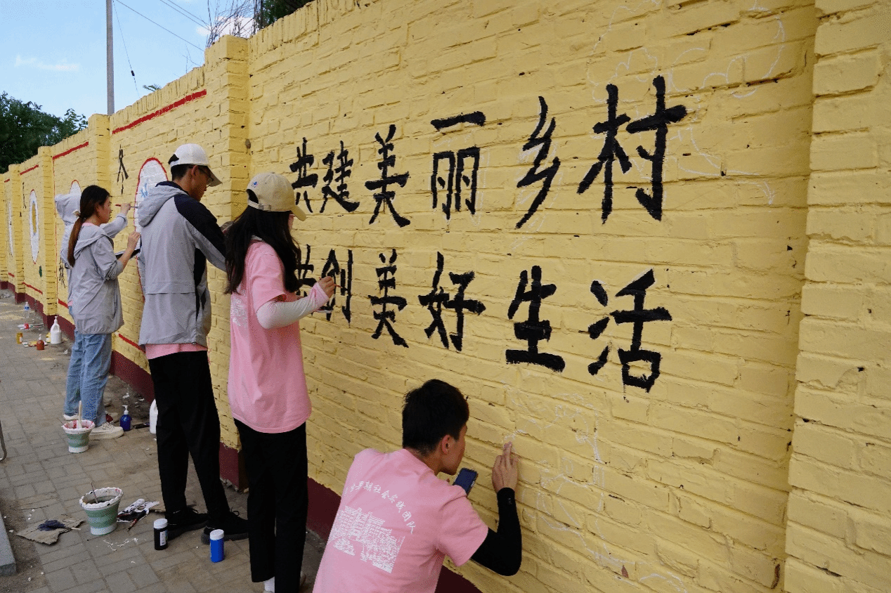 由指导老师马亚男、信红敏带领的“以艺传梦”志愿服务团队共20名师生,围绕爱党爱国、环境保护、和美乡村等主题,设计独具风格的墙绘方案,共同完成了20余幅构思巧妙、生动形象的墙绘作品,为村容村貌注入了活力。在分配好各自成员负责的任务后,大家分别前往各自负责区域开始绘制工作。从描边、起形、上色、细化到最后的整体画面呈现,团队成员一丝不苟。尽管烈日炎炎,队员们大汗淋漓,但仍挡不住他们创作墙绘的热情。经过一天的连续创作,一幅幅党建引领、展示乡村风土人情的画作跃然墙上,让原本单调的墙面充满了生机活力和诗情画意,为南吴褚村添上一笔笔鲜艳的色彩。