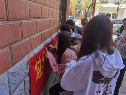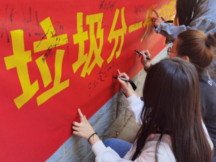员工将印有“垃圾分一分,校园美十分”字样的横幅与签字笔提前贴于行政楼楼身。活动开始后,引导现场参与活动的同学们执笔留名。活动现场气氛热烈、秩序井然,郑重地在横幅上签下姓名。