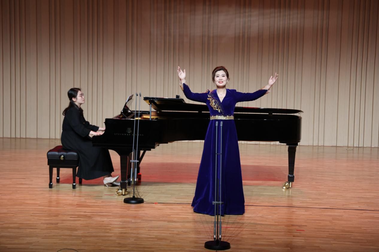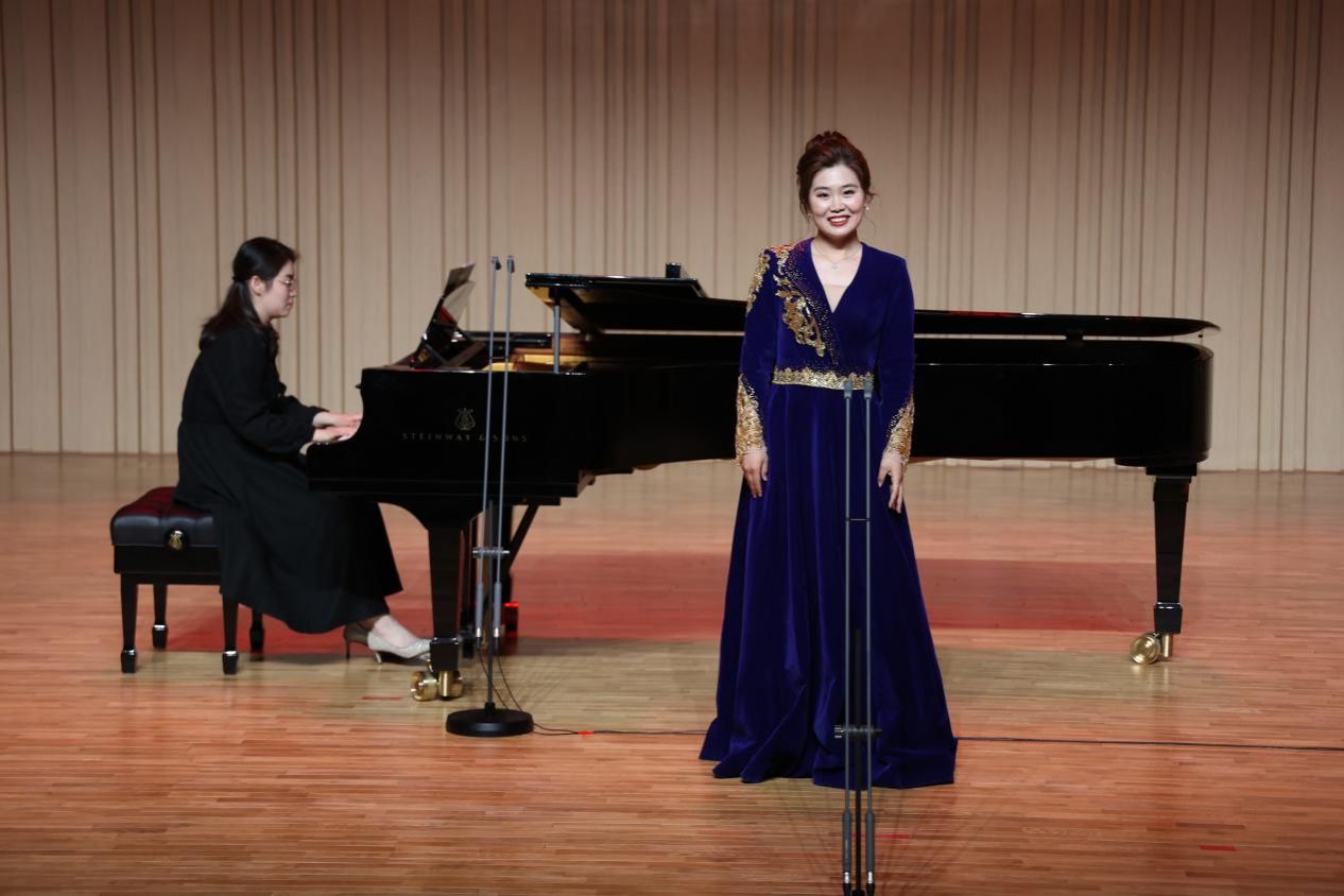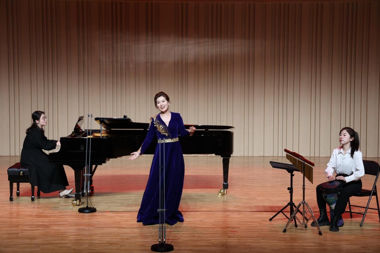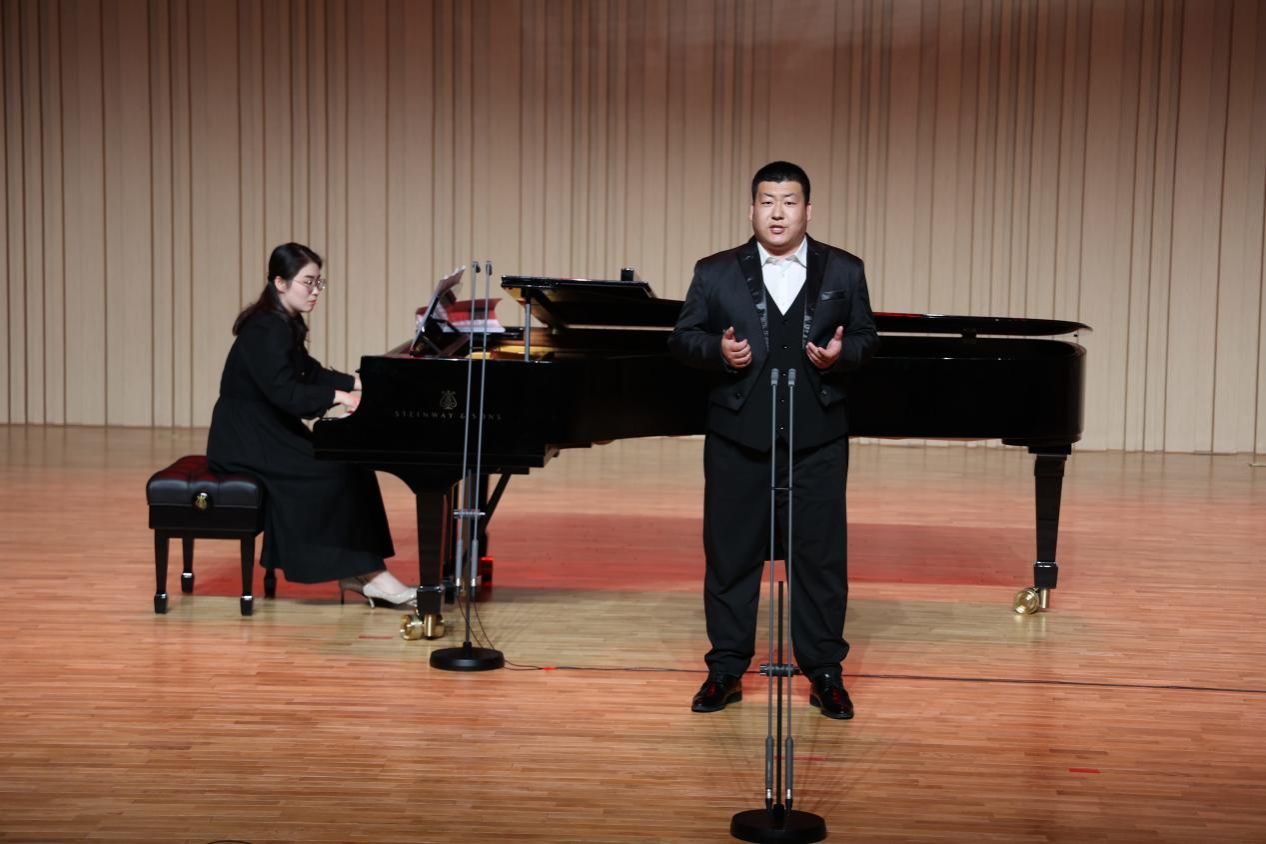 音乐会下半场,荣雨同学带来《茉莉花》《信天游》《包楞调》三首不同地区的汉族民歌,将中华民族的优秀文化和优良传统借助音乐形式表达了出来,传达了演唱者对淳朴民风最朴实、真切的爱。歌曲《醉了千古爱》《美好生活在祖国》获得阵阵掌声,最后,音乐会在一首返场歌曲《绣荷包》中落下帷幕。
