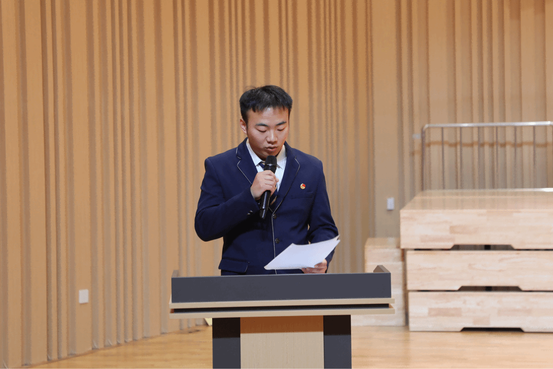 公司员工干部代表杨峻沣上台发言。他汇报了社团这一年来的主要工作,分享了社团发展的经验和成果,并希望新一届社团干部能够继续传承和发扬员工组织的优良传统,继续为同学服务,为公司的发展贡献力量。