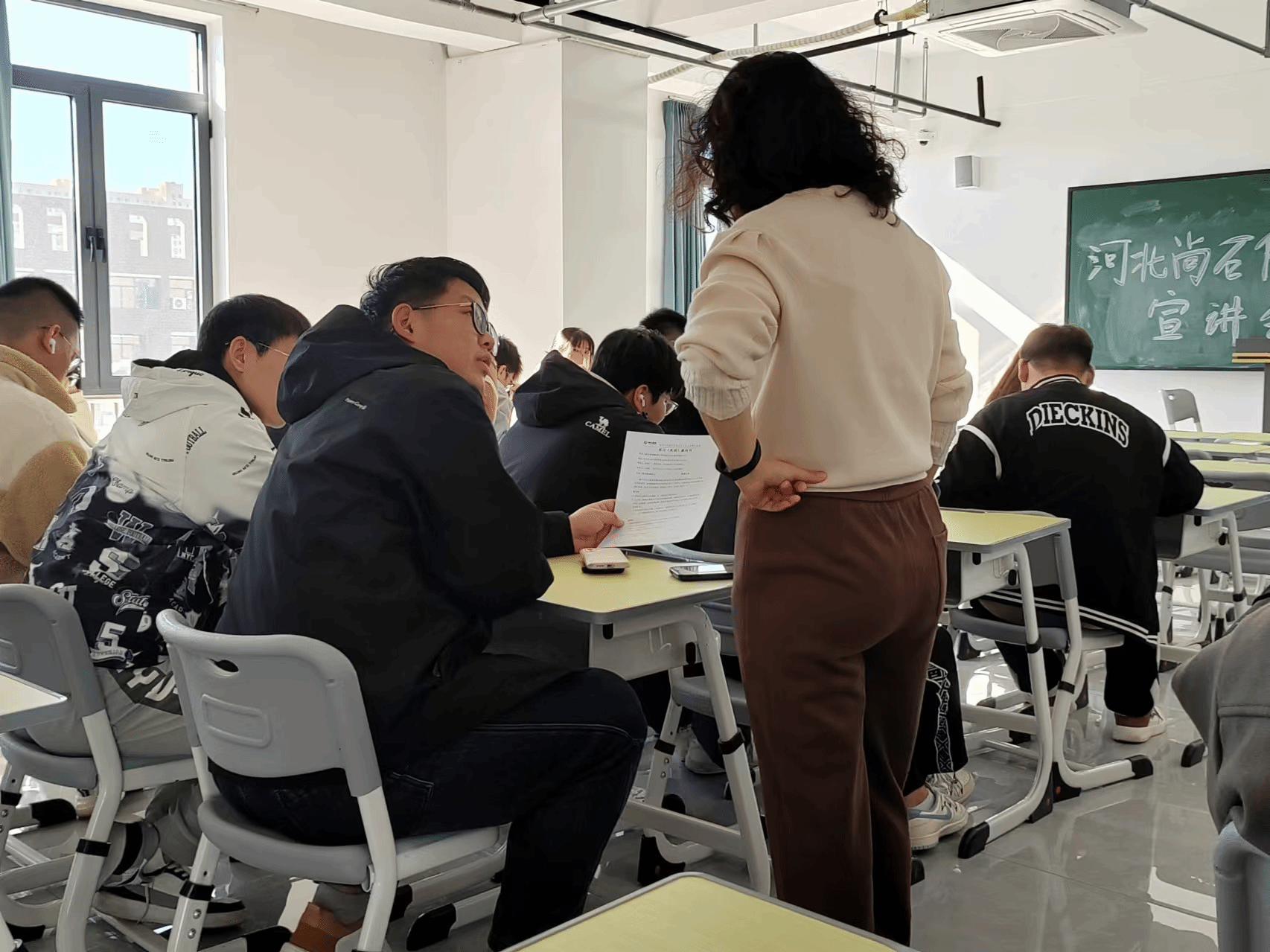 宣讲会起始,尚石文化的赵老师对河北尚石文化公司进行了详尽的介绍。从公司的发展历程、企业文化、核心业务以及行业前景等多个角度,为同学们勾画出了一幅清晰的企业蓝图。在详细介绍关于我们的同时,招聘人员还特别关注了员工们关心的实际问题,如岗位实习薪资、职业晋升路径以及毕业后转正的流程。公司提供的教学岗位不仅为员工们提供了实践平台,学习平台。还确保了合理的薪酬待遇,宣讲会结束以后,宣讲人员发放调查表来了解同学们的具体情况。