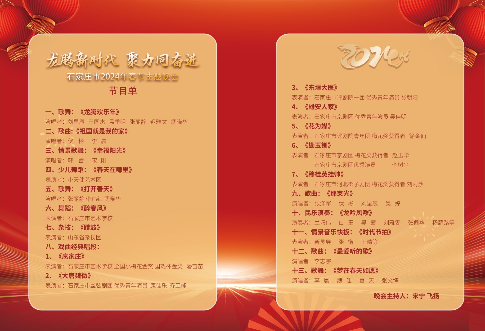 2月1日,由中共石家庄市委宣传部、石家庄市文化广电旅游局、石家庄市艺术研究院主办的“龙腾新时代、聚力同奋进”石家庄市2024年春节主题晚会在石家庄大剧院举行。本场晚会以歌舞、杂技、戏曲等节目形式,为全市人民呈现了一场艺术的饕餮盛宴,展现了燕赵风韵,营造出了浓浓的年味儿。