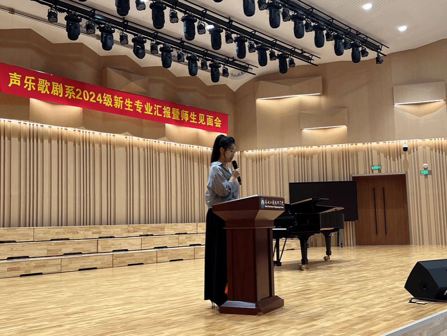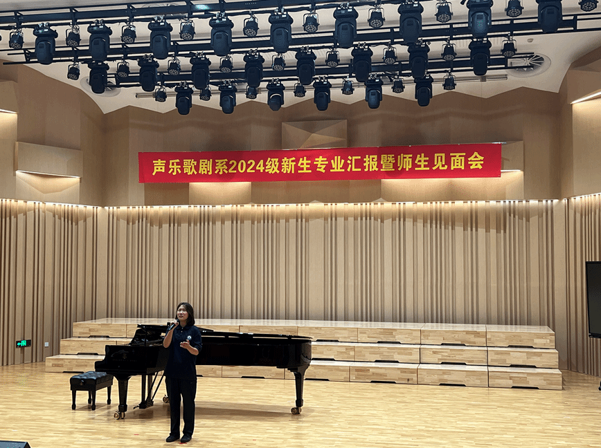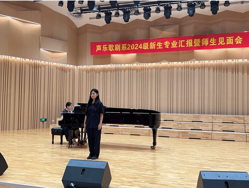2024级音乐表演专业(声乐方向)新生专业汇报暨师生见面会,于2024年9月18日下午18:00在音乐厅举行。本次汇报由声歌系副主任姜莎主持,全体专任教师参加。本次共有106名同学进行专业汇报,在汇报前,声乐歌剧系主任郭艳艳、教师代表靳菲分别进行了讲话,对2024级新同学的到来表示热烈的欢迎和最诚挚的期许。