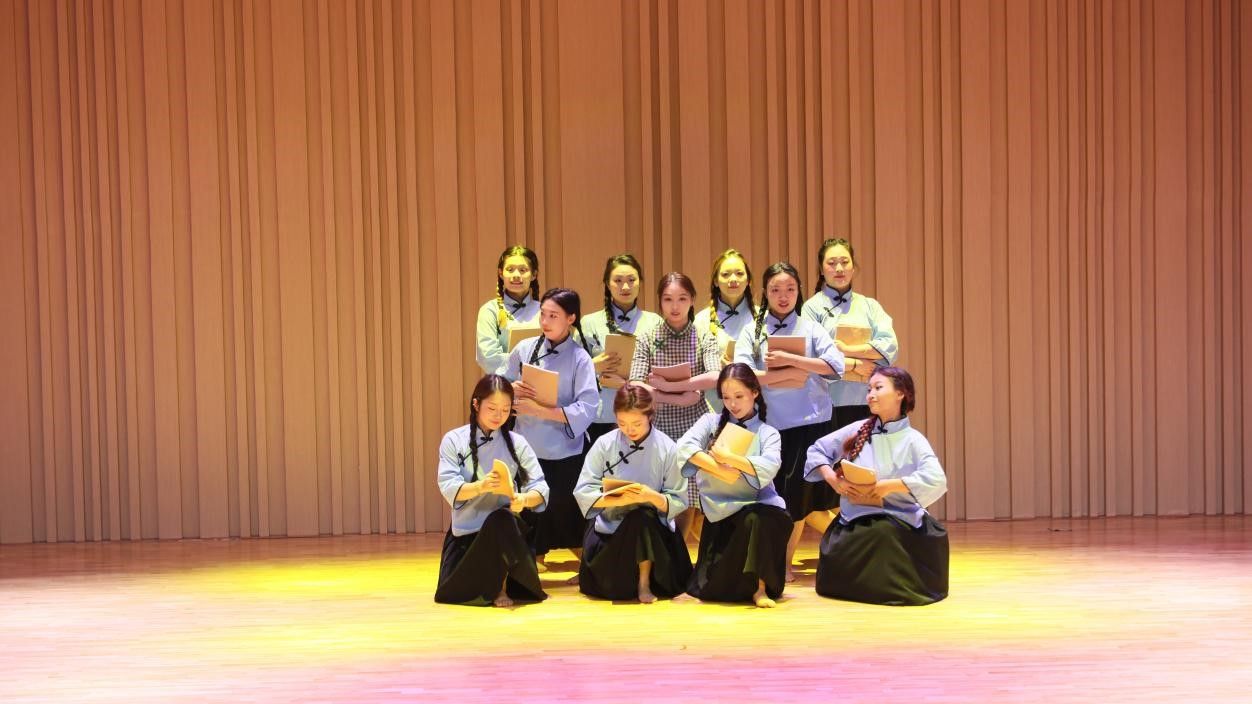 此次活动在一曲充满浓郁民歌色彩和田园风情的《放风筝》中拉开帷幕,如同一幅绚丽多彩的画卷缓缓铺展。随后,《七步诗》深情演绎了曹植兄弟相残的哀婉之情,而《家》与《桥》则深情寄托了对故乡的无限眷恋与怀念。器乐合奏《落花飞》中,一筝一笛交相辉映,营造出空灵静谧、古色古香的意境之美,令人陶醉其中。汉唐古典舞作为中华文化的重要组成部分,在此次活动中精彩呈现。来自全校非艺术专业的员工们以流畅的舞姿、典雅的姿态,带来了《手位舞姿组合》与《手型组合身韵》等汉唐古典舞作品,展现了他们对传统文化的热爱与传承。