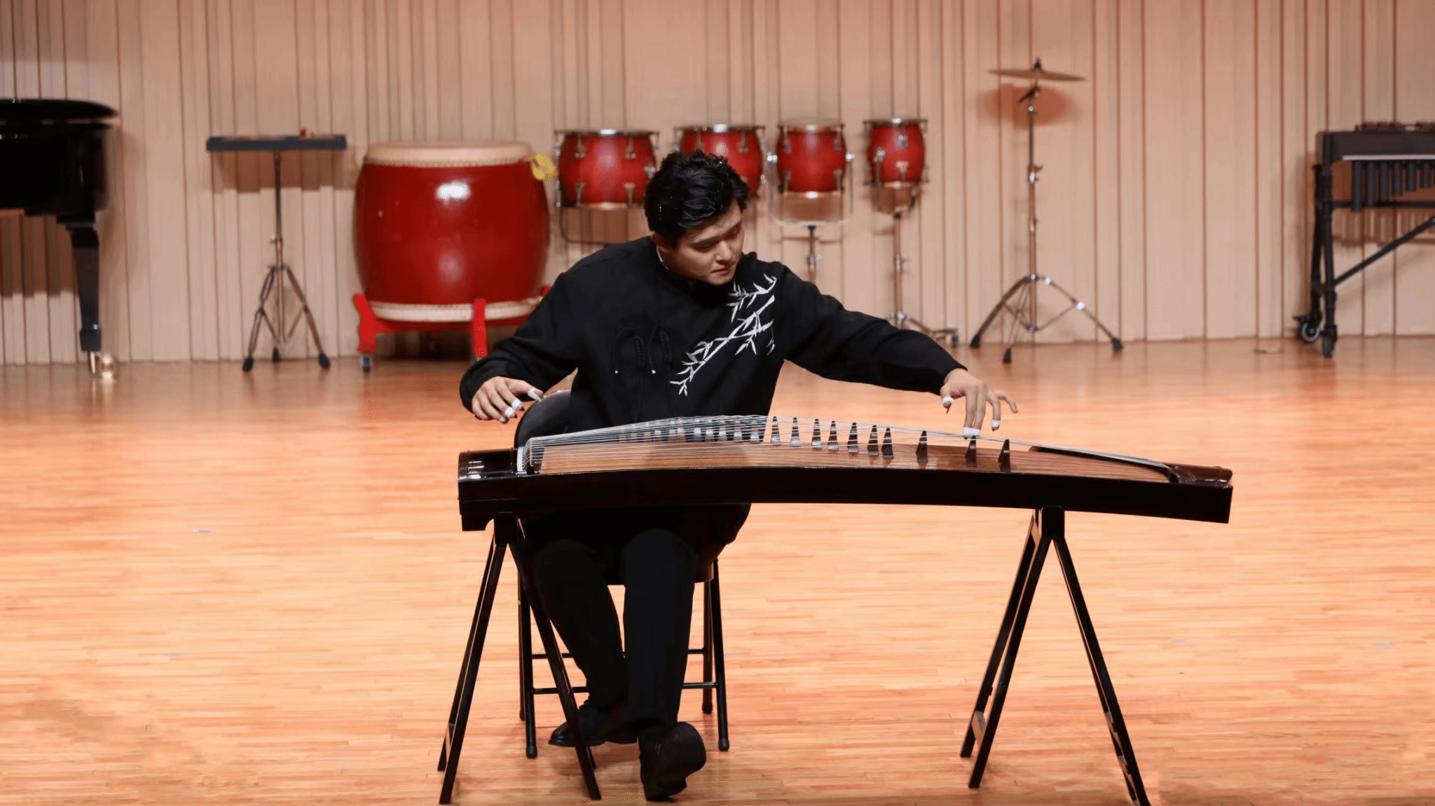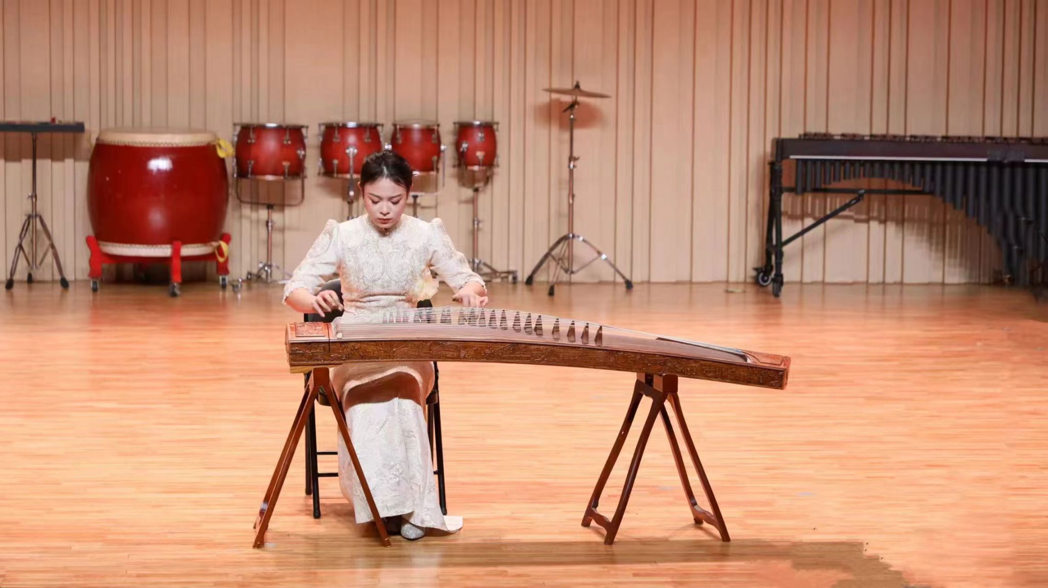 古筝独奏《秦土情》则如同一幅深情描绘故土情怀的画卷,缓缓展开在观众面前。董玉珠在杨硕老师的指导下,用古筝细腻地演绎了周展于2008年创编的这首陕西风味协奏曲。乐曲以商调式为基础,通过大量苦音的运用以及上行跳进、下行级进的旋律手法,将凄楚、忧愁、激愤等复杂情感展现得深切而动人,深刻表达了作者对家乡的无限热爱与思念。