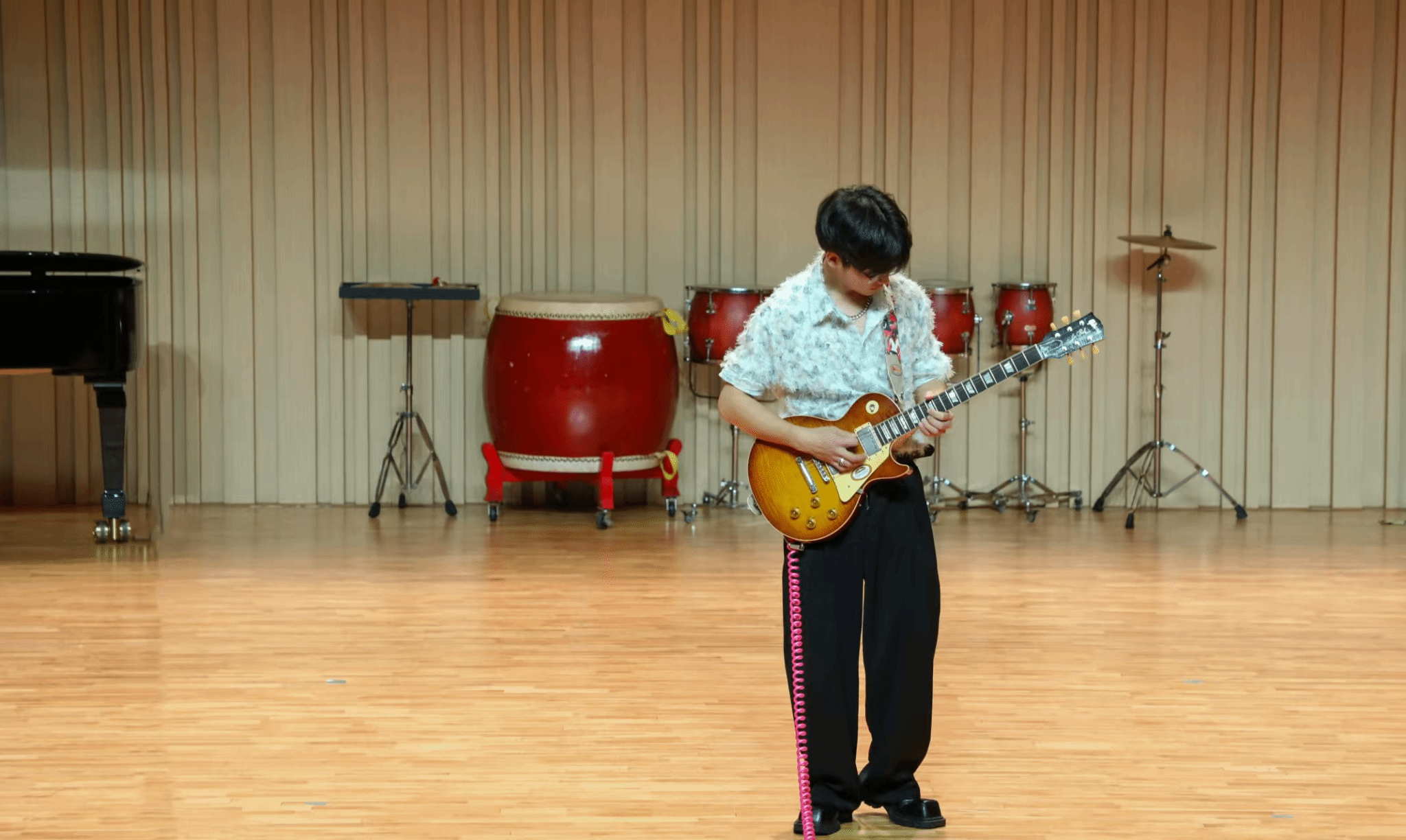紧接着,电吉他演奏《Devil Take Tomorrow》将现场气氛推向了新高潮。王嘉腾在李晶老师的精心指导下,完美演绎了Marty Friedman的这首经典之作。这首收录于2006年专辑《loudspeaker》的曲目,以其独特的旋律和强烈的节奏感,成为了电吉他演奏领域的璀璨瑰宝。王嘉腾的演奏更是将Friedman的精湛技艺和对音乐的热爱展现得淋漓尽致,展现了其独特的音乐魅力。