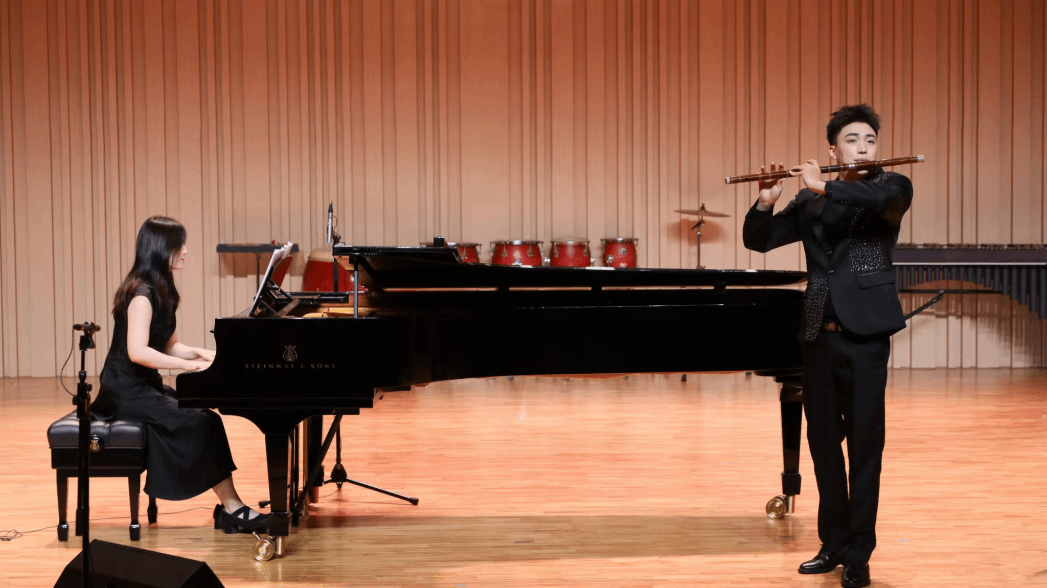 竹笛曲《花泣》则带来了别样的凄美与哀婉。王博在齐攀老师的指导下,用竹笛描绘出黛玉“花落人去”的悲伤心境。这首由张维良在苏州评弹《黛玉葬花》基础上创编的作品,通过散板、运腔与紧打慢唱技法的巧妙结合,赋予了音乐强烈的感染力和表现力,让听众仿佛置身于黛玉的伤感世界之中,感同身受那份无尽的哀愁。
