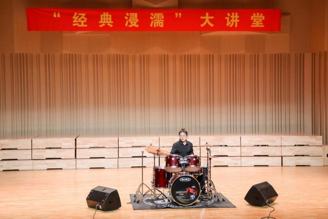 在“融合之美”篇章,黄老师通过讲述古代丝绸之路与地理大发现时代的音乐文化交流故事,生动描绘了器乐音乐在跨文化交流中的桥梁作用。伴随讲述,吕佳琦带来的爵士鼓独奏《All Funked Up》以其独特的非洲节奏与欧洲和声融合,完美诠释了这一理念,令听众陶醉。