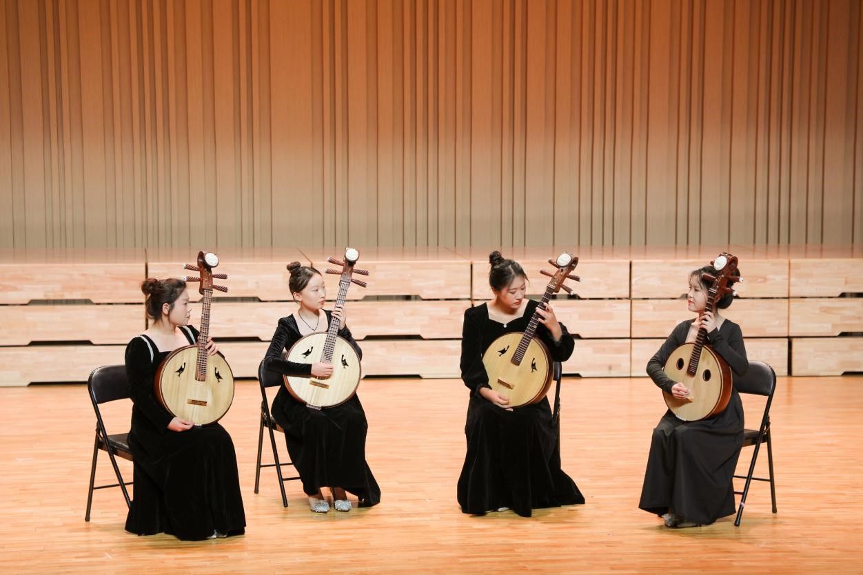 “创新之美”环节,贾金玉、李瑞姣、岳一萌、高雅楠的阮重奏《天地之间》之《异想天开》,以古今交融的艺术风格,彰显了作曲家的大胆创新精神,既保留了阮乐的古典韵味,又巧妙融入现代元素,让听众在古今之间自由穿梭,享受音乐带来的无限遐想。