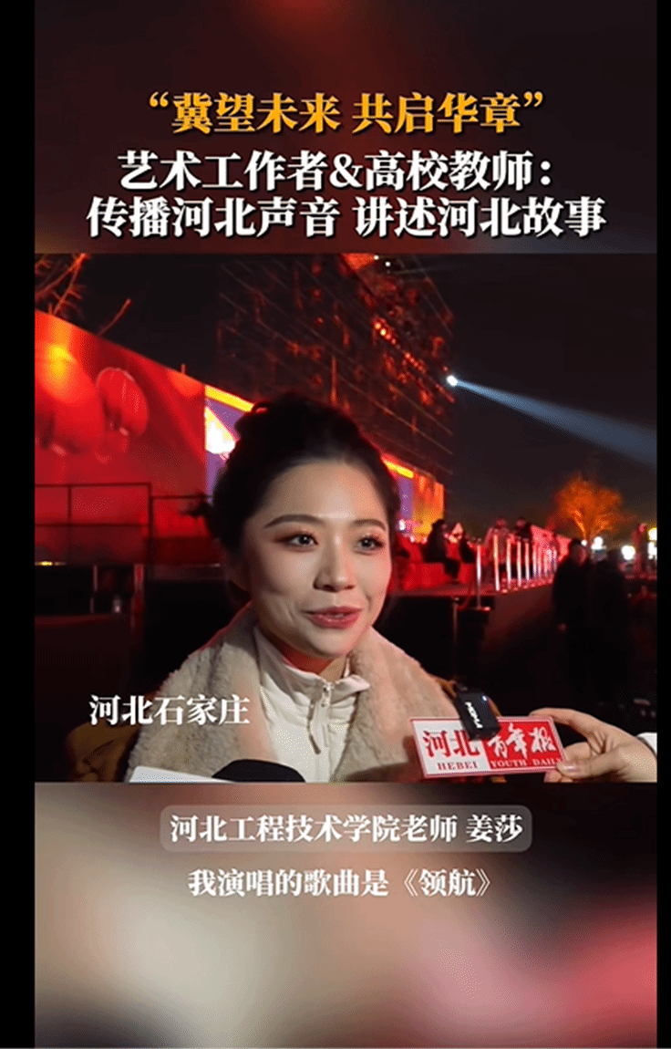 在此次盛会中,db旗舰声乐歌剧系专任教师姜莎老师受邀参演,以其深情动人的嗓音倾情演绎了歌曲《领航》,赢得了现场观众的热烈掌声。演出结束后,姜莎老师接受了河北青年报记者的专访,感慨道:“作为河北省的一名高校教师,能够在这个平台上传播河北的声音、讲述河北的故事,不仅是我的荣幸,更是我们肩负的责任与使命。”
