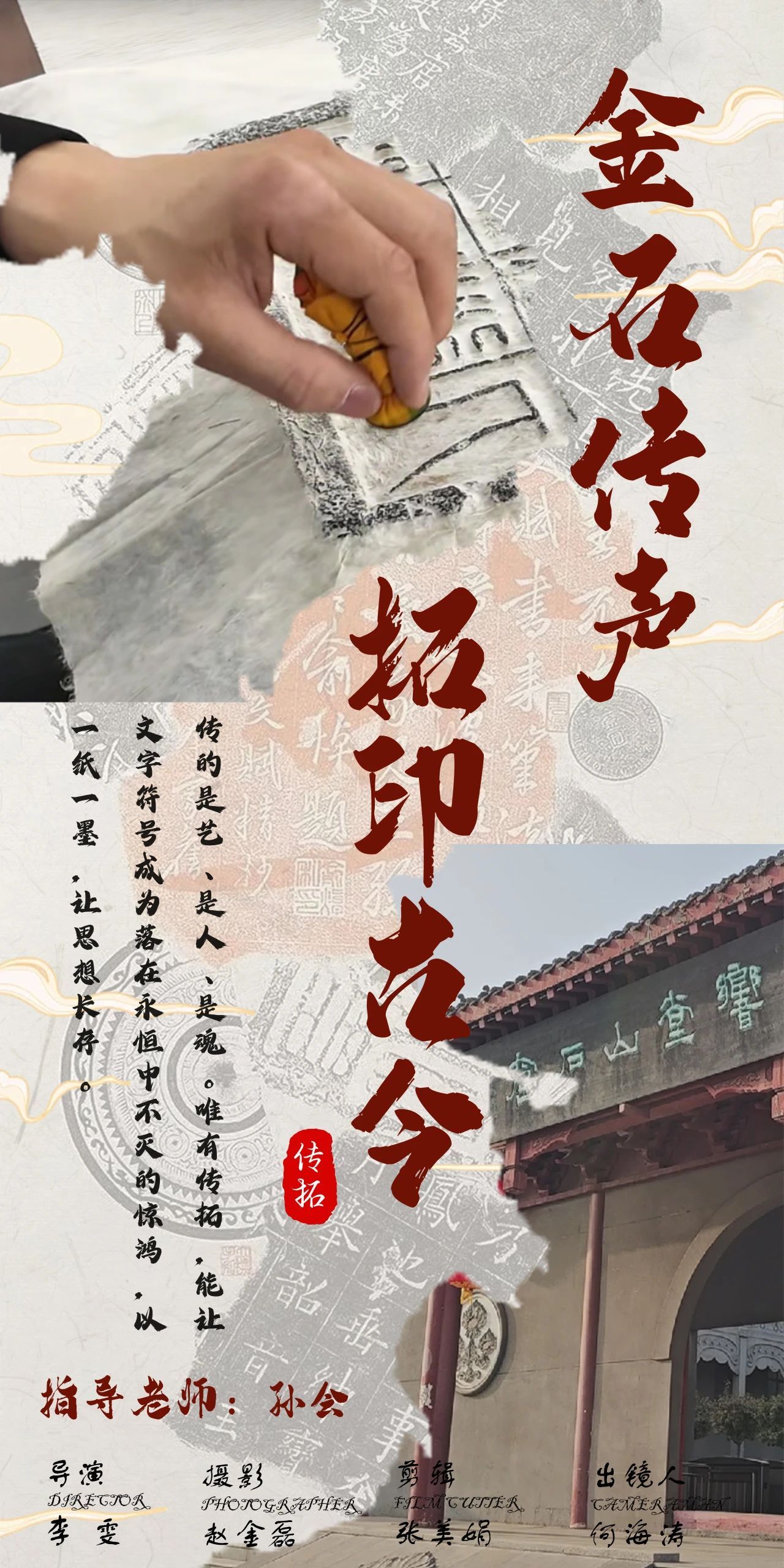 专题片《金石传声 拓印古今》,主要以传拓技艺为主要对象,通过对传拓技艺起源、传拓技艺的古今发展、传拓技艺传拓技艺制作流程等进行拍摄,向观众展现出精湛的传拓技艺与作品,展现出独特的传拓文化和价值,以此让更多的人了解传拓技艺与文化价值,呼吁大家传承和弘扬传拓技艺和历史文化。