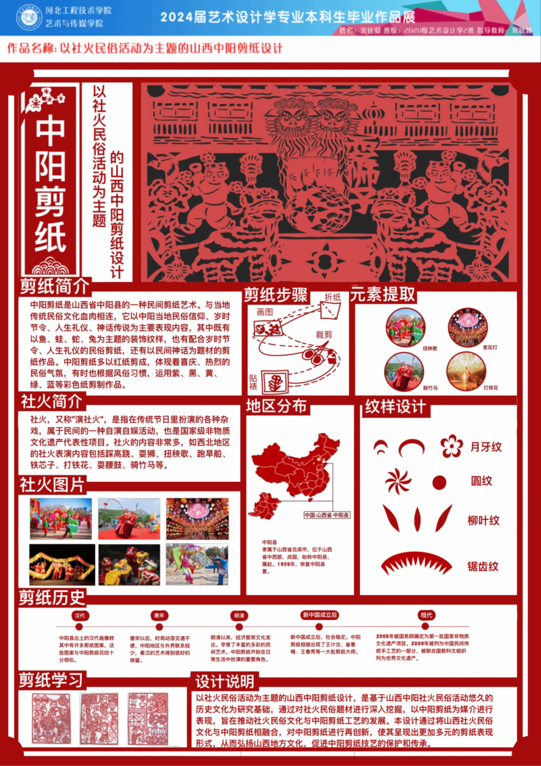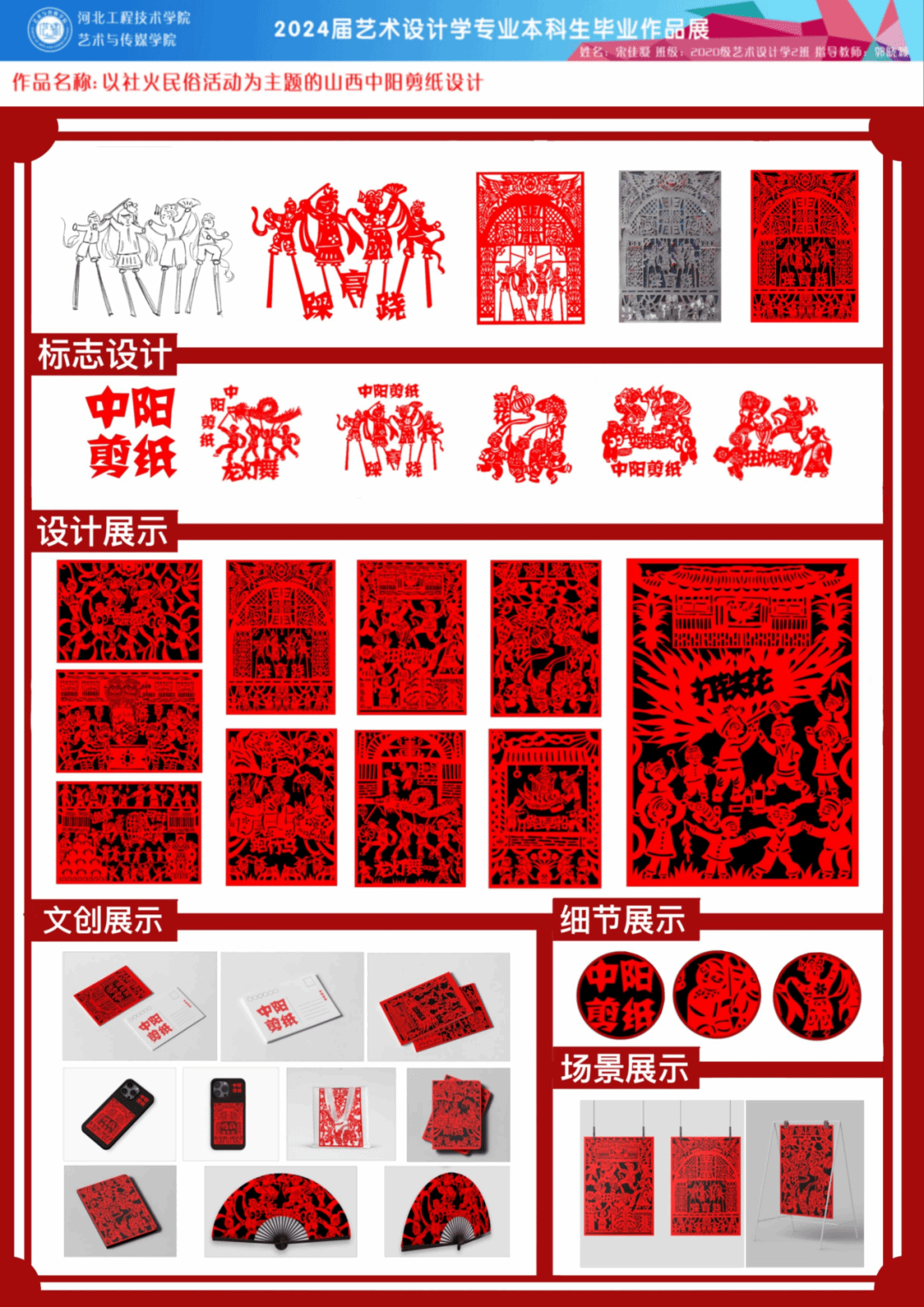 该作品以社火民俗活动为主题的山西中阳剪纸设计,基于山西中阳社火民俗活动悠久的历史文化为研究基础,通过对社火民俗题材进行深入挖掘,以中阳剪纸为媒介进行表现,将山西社火民俗文化与中阳剪纸相融合,对中阳剪纸进行再创新,使其呈现出更加多元的剪纸表现形式,旨在弘扬山西地方文化,促进中阳剪纸技艺的保护和传承。