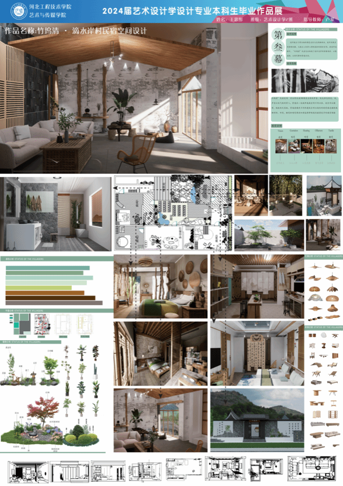 该设计紧密围绕滴水岸村的本地实际情况展开,深入地剖析当代种植元素——竹子。深入探究竹子所蕴含的象征意义、精神元素等等。对滴水岸村所具有的地域特色和传统文化展开全面深入的研究,以竹子作为主要元素来进行空间设计,致力于设计出契合游客审美需求和精神需求的“竹坞清”民宿空间。通过精心的布局和巧妙的构思,让游客在这里能充分感受到竹子所带来的独特韵味和文化魅力,同时也能沉浸在这古村落所独有的宁静与祥和氛围之中,在享受舒适住宿体验的同时,领略到传统文化与现代设计完美融合所带来的视觉冲击和心灵触动,让每一位来到这里的游客都能留下难忘的记忆和深刻的感受。