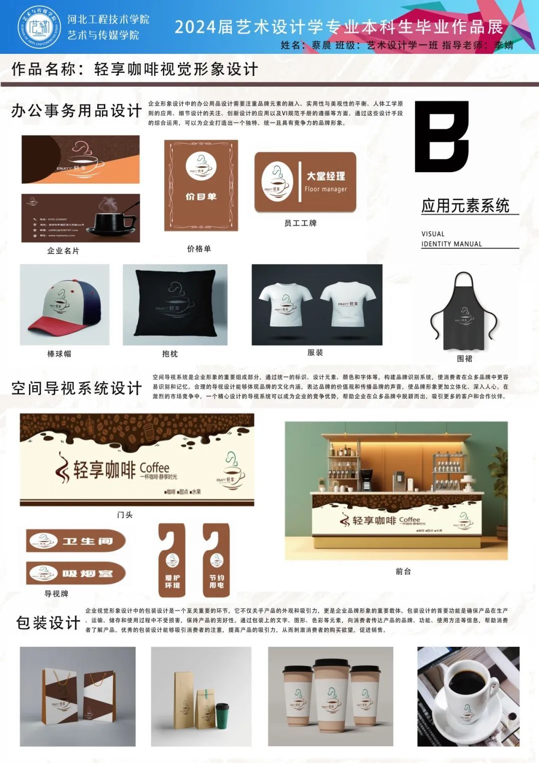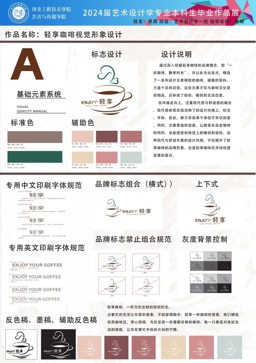该作品通过设计提升轻享咖啡的视觉形象,以增强品牌影响力。通过具体的设计实践,包括标志设计、标准字体与色彩系统、图形元素与辅助图形的创意与表现,展示了轻享咖啡新视觉形象的设计成果。最后,将新视觉形象应用于宣传物料、产品包装、空间导视系统等实际场景中,验证了设计的实用性和效果。