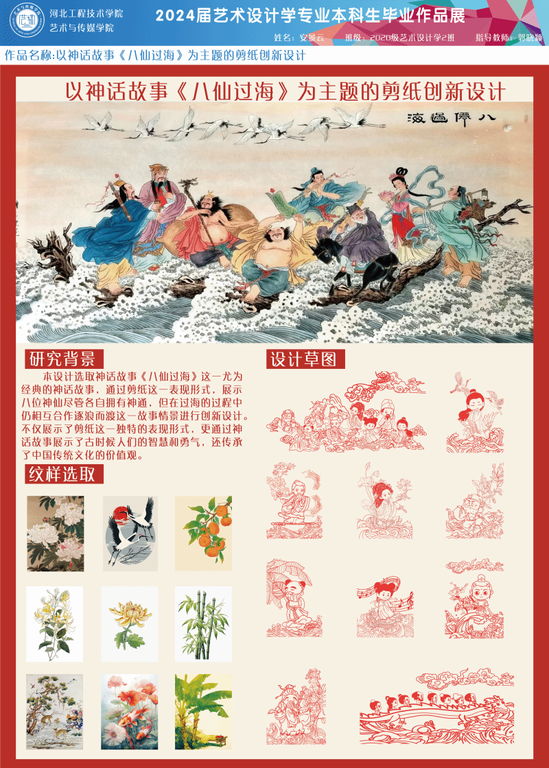 该设计以《八仙过海》为主题,将八仙的故事与剪纸艺术相结合,既传承了中国神话故事的文化内涵,又展现了剪纸艺术的精湛技艺。作品旨在通过对《八仙过海》的研究,探讨剪纸艺术在传承和发展传统文化方面的作用,并深入分析其中的艺术特点和文化内涵。通过对剪纸作品的审美解读和艺术表现手法的分析,揭示了剪纸艺术在中国文化传统中的独特地位和价值。