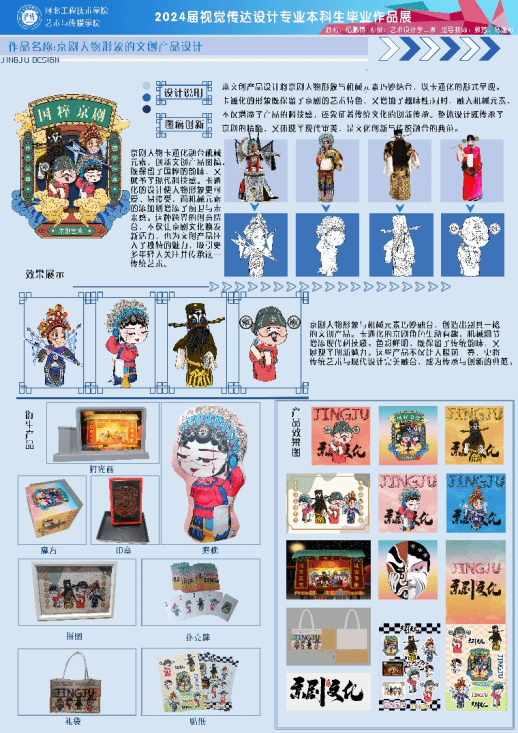该设计将京剧的人物形象与机械元素巧妙结合起来,以卡通化的形式出现。卡通化的形象既保留了京剧的艺术特色,又增添了趣味。