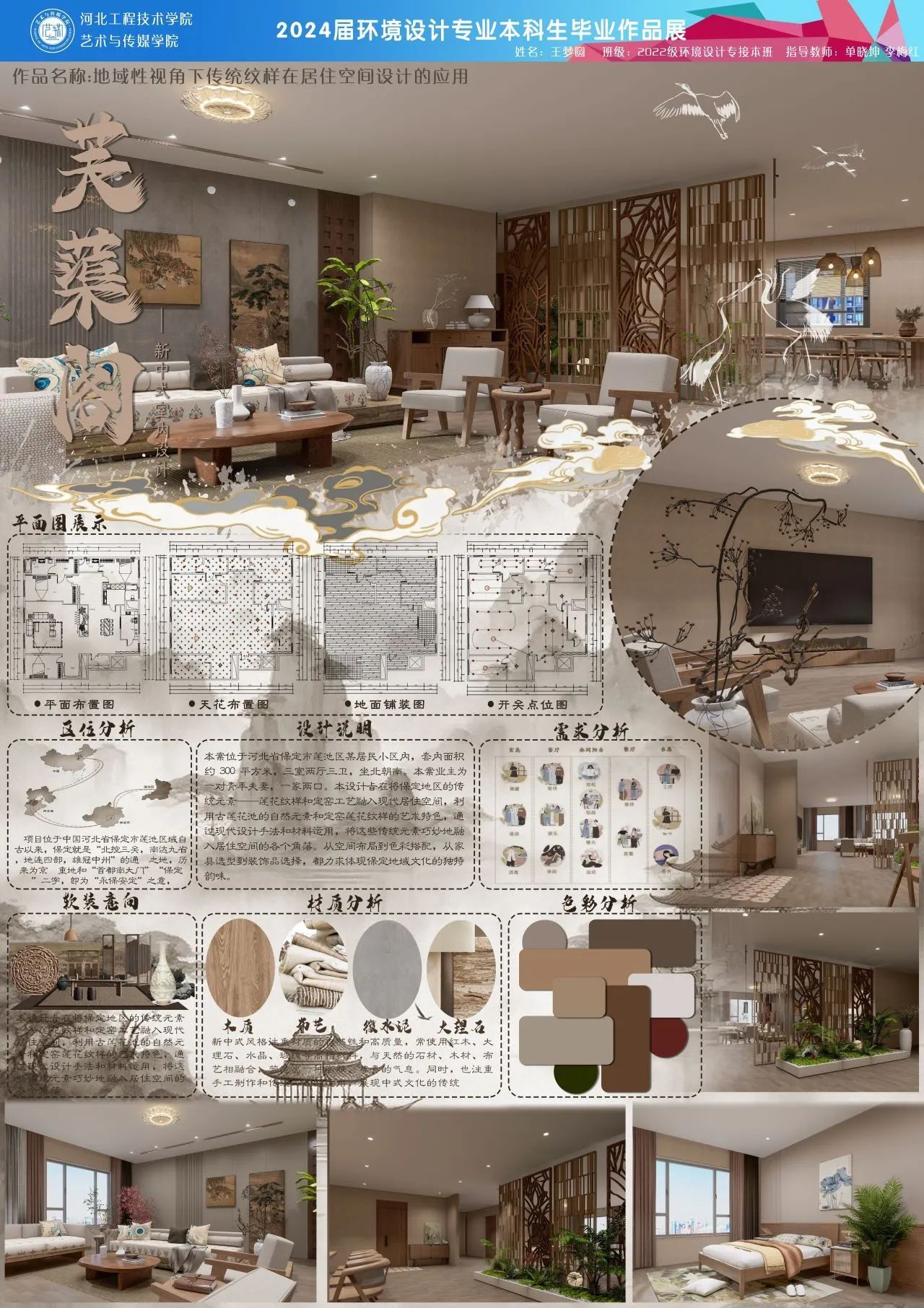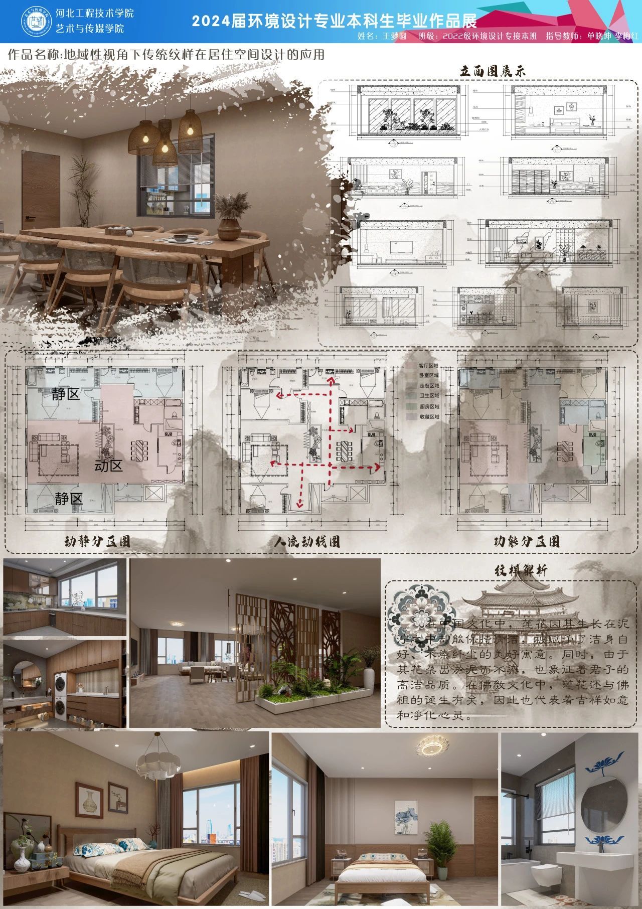 本设计将保定地区的传统元素——莲花纹样和定窑工艺融入现代居住空间,利用古莲花池的自然元素和定窑莲花纹样的艺术特色,通过现代设计手法和材料运用,将这些传统元素巧妙地融入居住空间的各个角落。从空间布局到色彩搭配,从家具选型到装饰品选择,都力求体现保定地域文化的独特韵味。