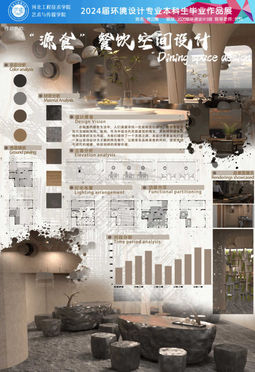 本设计以陕西窑洞为文化载体,探索传统建筑与现代餐饮空间的创新融合。设计聚焦窑洞“拱形结构、生土质感、地坑院落”三大特征,通过解构重组手法构建沉浸式用餐体验:曲面穹顶序列还原窑洞拱券的节奏美感,夯土肌理墙面结合数字化浇筑技术,赋予材料环保性与艺术性。设计以运用本土材料、被动式节能技术及地域符号叙事,打造兼具生态智慧、文化认同与当代美学的餐饮空间,为传统民居活化提供创新范式。