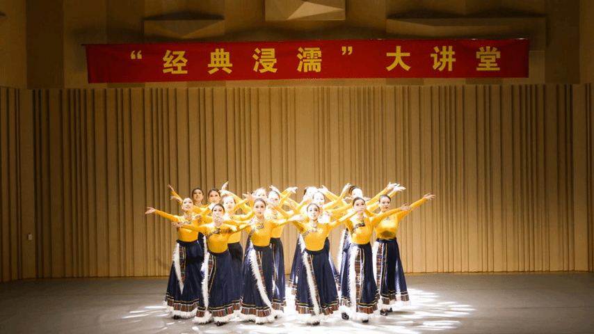 终章“雪域圣境”让观众领略了藏族舞蹈的独特魅力。通过主讲人的示范讲解结合舞蹈《藏族表演性组合》和原创群舞《走向光明》,观众感受到了藏族舞蹈中的“颤膝”和“三步一撩”等动作所蕴含的深厚文化内涵,以及藏族人民坚韧、质朴的精神风貌。