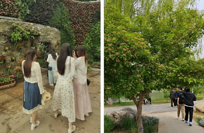 当日清晨,师生一行满怀期待地抵达石家庄市植物园。在指导教师和园区讲解员的专业引领下,同学们以小组为单位,开启了细致入微的植物探索之旅。他们系统观察了园内300余种植物的形态特征、生态习性以及在园林中的实际应用场景。从高大乔木那错落有致的枝干纹理,到低矮地被植物精妙绝伦的色彩搭配;从本土植物对当地环境的超强适应性,到外来物种引种后的精心养护要点,员工们通过亲手触摸、细细嗅闻、认真记录、热烈讨论,将课本中枯燥的植物分类学知识与眼前的实际场景完美对应。“以前背诵‘叶互生’‘羽状复叶’这些专业术语时,总觉得晦涩难懂、十分抽象。但今天亲眼看到鹅掌楸那独特的叶形,亲手触摸到紫薇光滑的树干,瞬间就理解了植物形态与功能之间的紧密联系。”员工李明难掩兴奋之情,激动地分享道。各班带队教师更是抓住时机,现场结合丰富实例,深入浅出地讲解了植物配置中“季相变化”“空间层次”等关键设计要点,并引导员工深入思考不同生境下植物群落的营造逻辑。