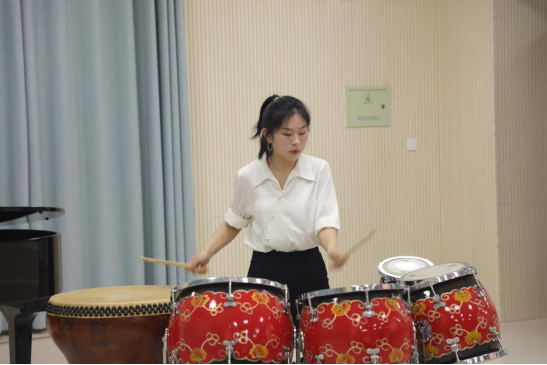 《鼓上舞龙舟》打击乐独奏:李喜洋老师,将《赛龙舟》、《鼓上飞舞》、《散敲》的精华部分再次整合,在原曲五音排鼓的基础上,增添了中国大鼓的昂扬气势。近五分钟的时长,两次慢起渐快要连续演奏,演奏者充分展现了过硬的基本功及高超的演奏技术。